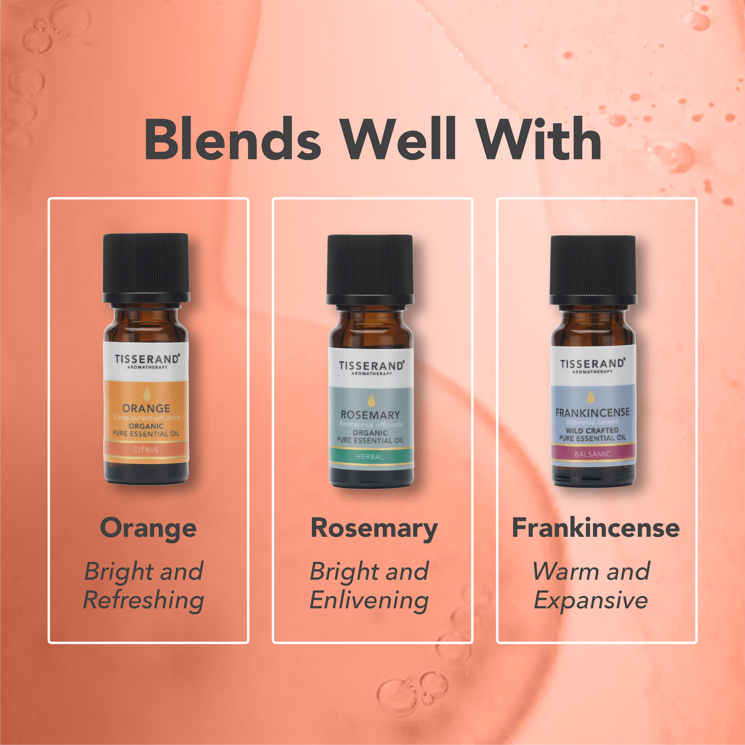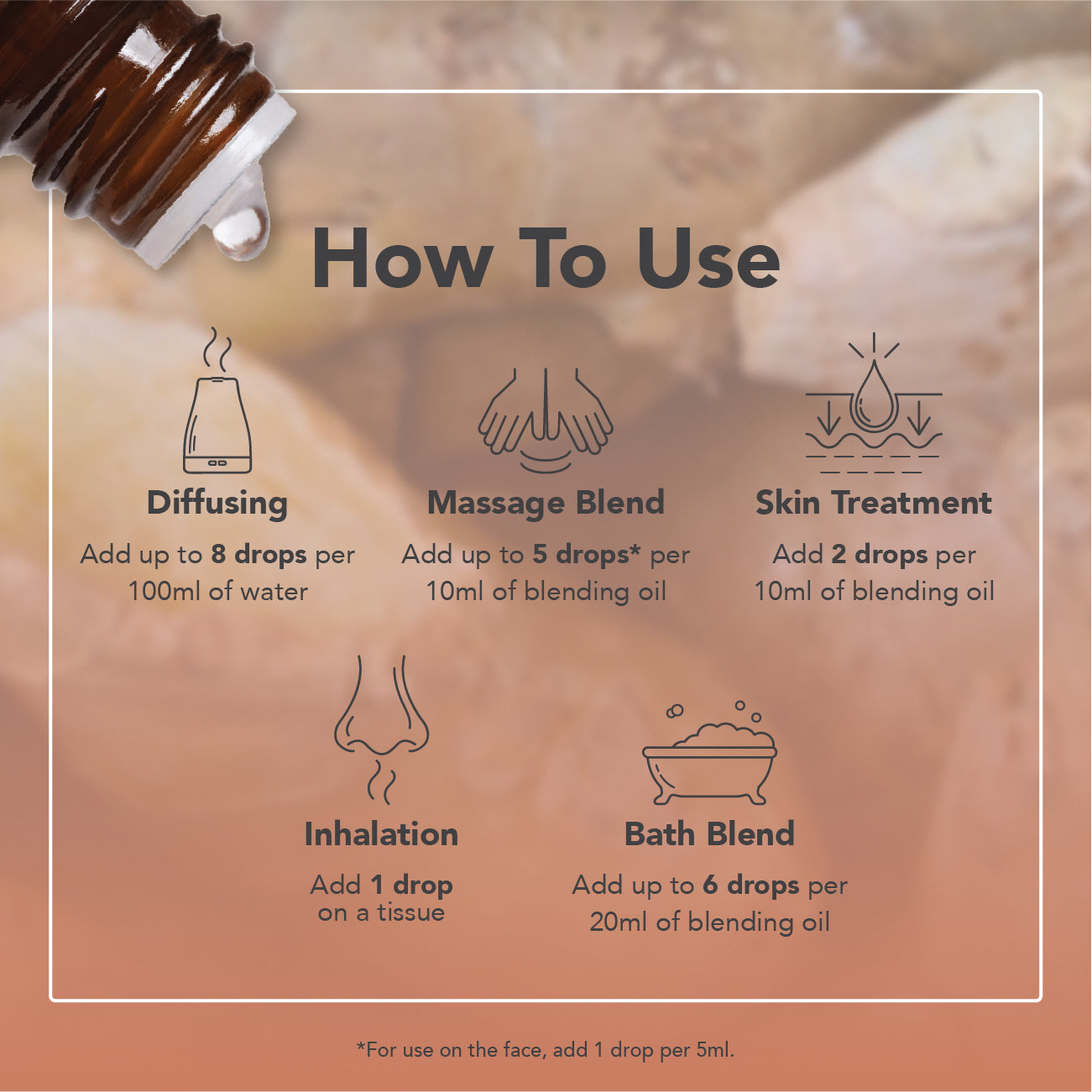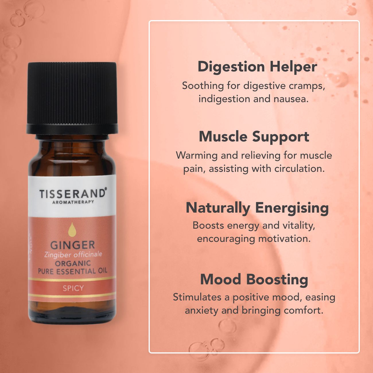 Ginger essential oil has a warm and spicy aroma with rich, comforting notes that deepen as it evaporates. Its uplifting scent can help to energise the mind, soothe feelings of anxiety and quell low motivation, providing comfort in times of need. Ginger is also a popular choice for treating travel sickness and nausea.