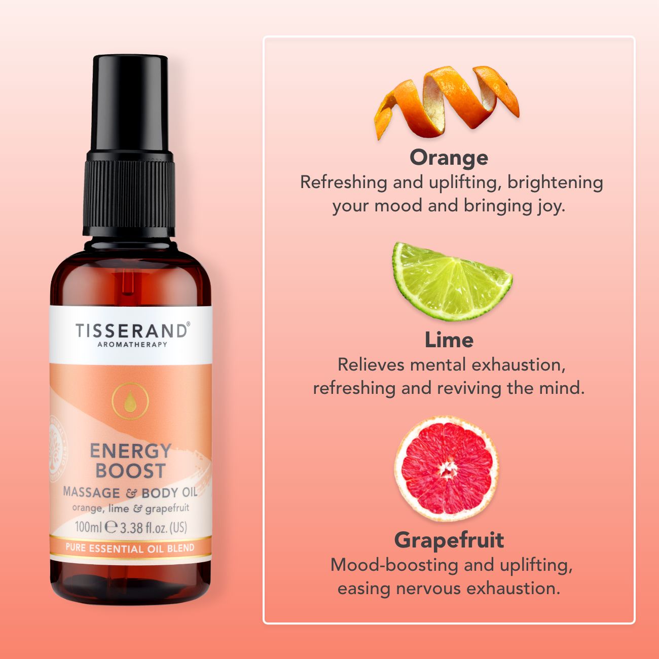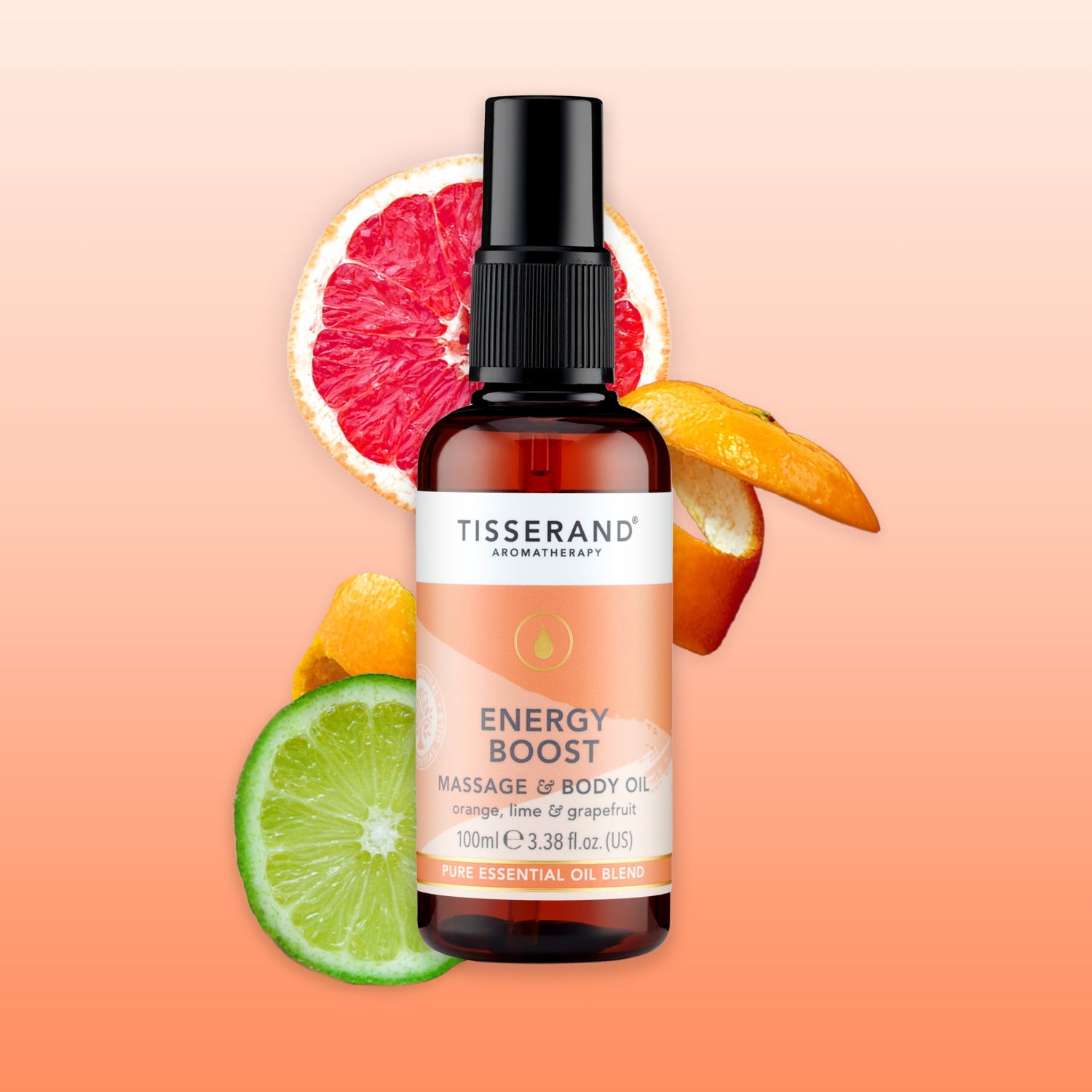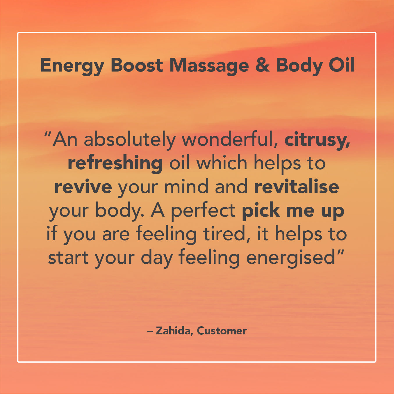 Nourish your skin and awaken your senses with the Energy Boost Massage & Body Oil. In a skin-pampering base of Sesame and Jojoba, this deeply nourishing oil is rich in vitamins, antioxidants, and Omega 6 and 9 fatty acids. Perfect for awakening the body with a stimulating massage, it’s expertly blended with 100% natural pure essential oils of uplifting Orange, energising Lime and refreshing Grapefruit to help clear mental fog and leave you with naturally hydrated citrus-fragranced skin whenever you need a boost.