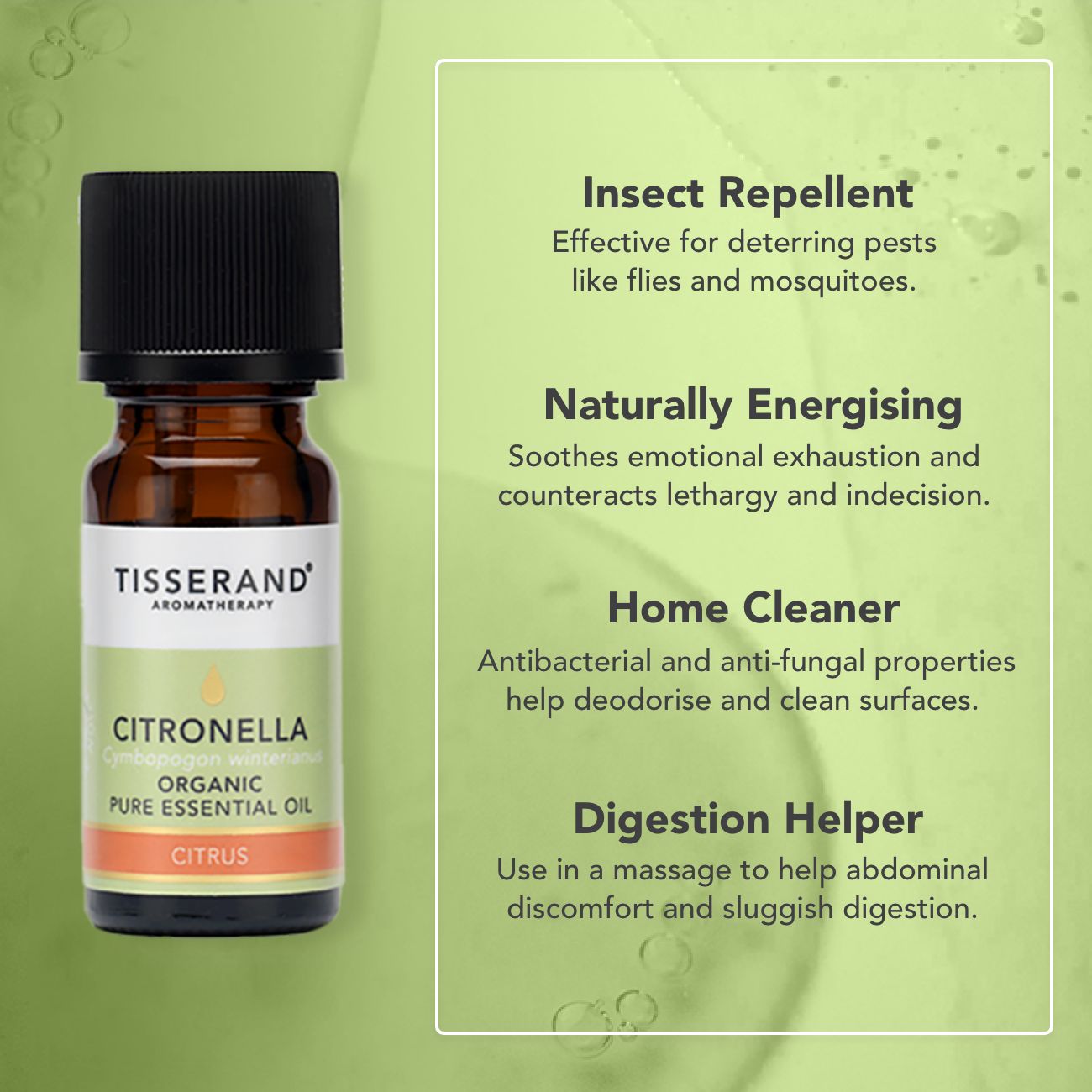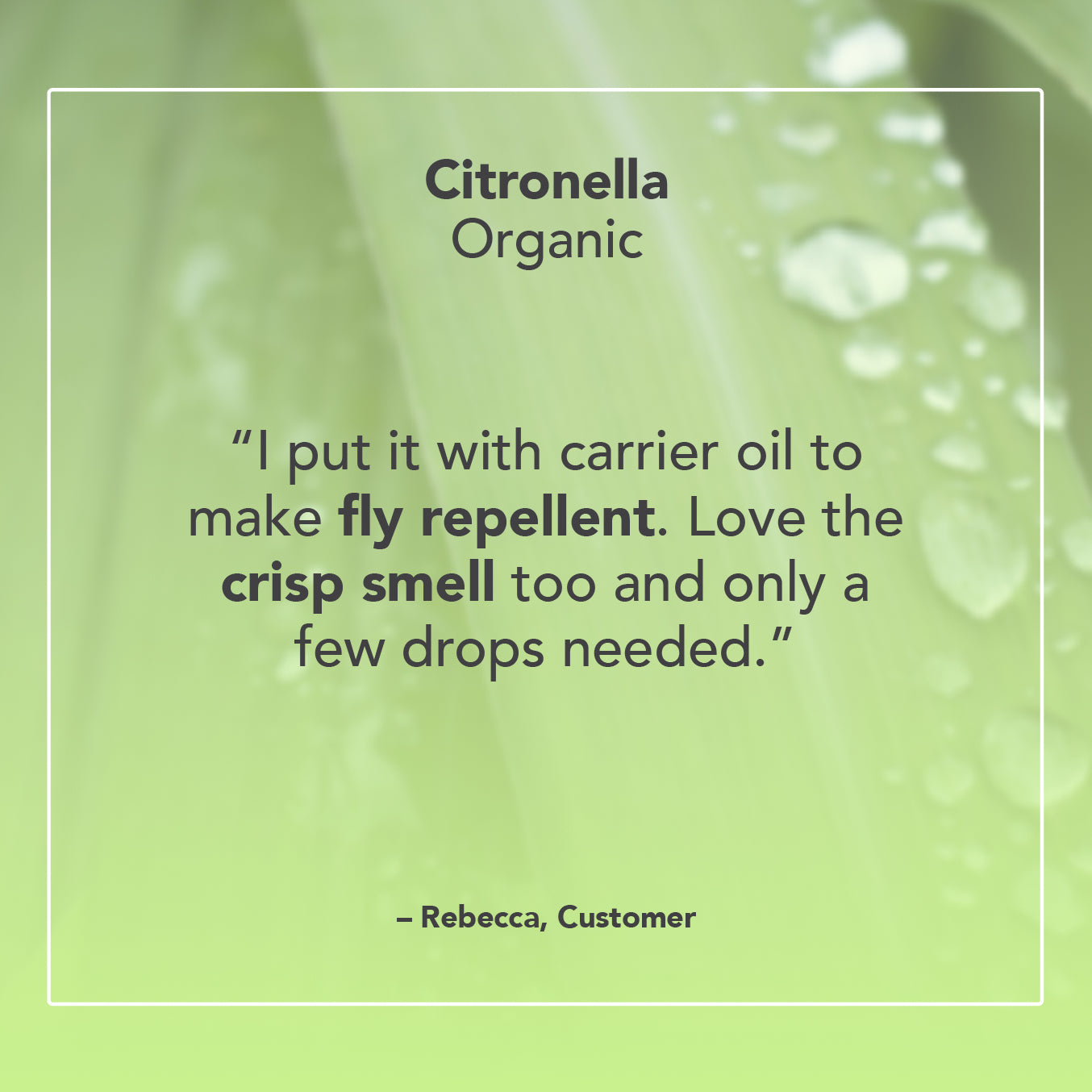 Citronella essential oil has a zesty, citrusy aroma with sweet, grassy undertones that become more noticeable as it settles. Its fresh, lemony scent is both uplifting and invigorating. It can bring a sense of clarity and energy to any space. It is also an effective natural insect repellent.
