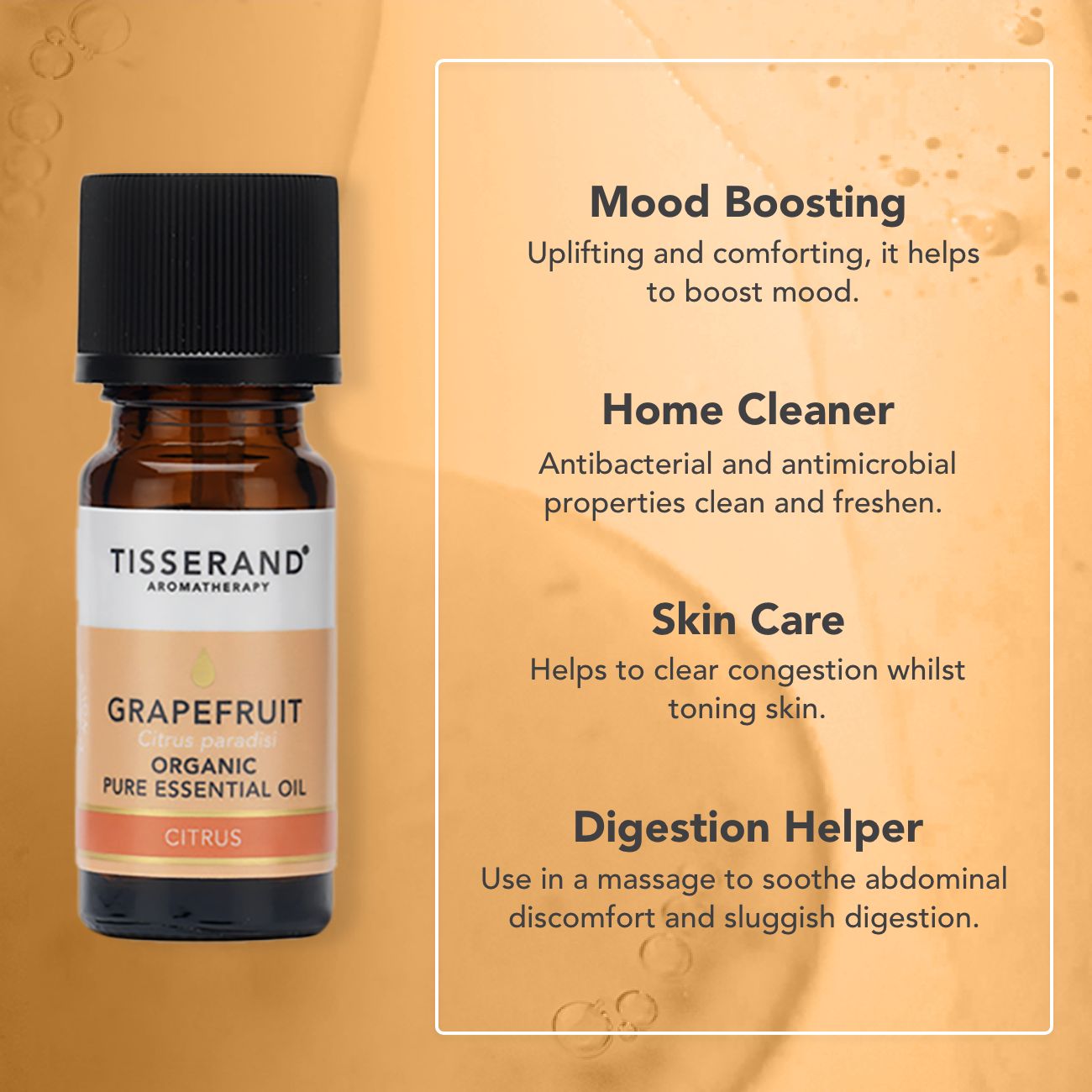Grapefruit essential oil has a bittersweet, fizzy citrus aroma that’s both tangy and juicy. With fresh, green notes and a sharp, sunny brightness, it delivers an instant lift to the senses. Its vibrant scent is like bottled sunshine: refreshing, revitalising and uplifting the mind.