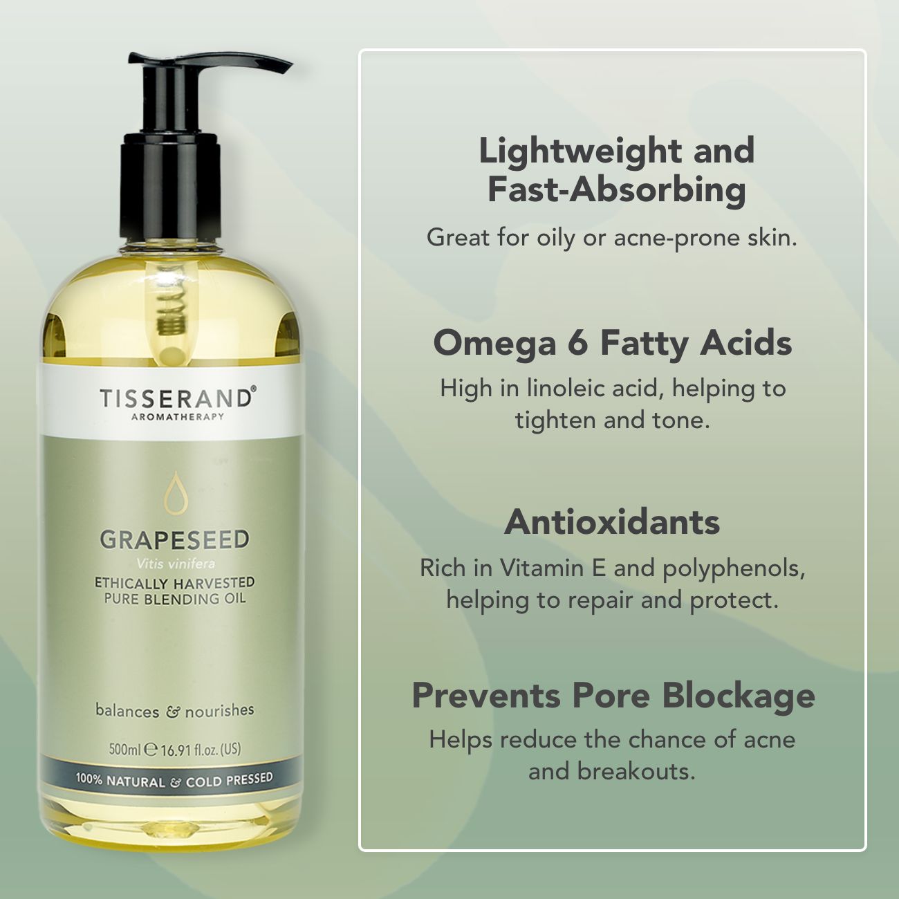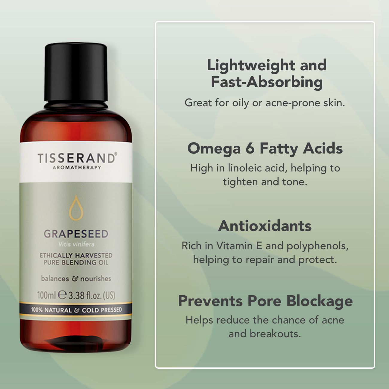 Delicately lightweight and easily absorbed, Grapeseed Oil is a versatile blending oil that’s naturally rich in vitamins D, C and E, as well as essential fatty acids. It hydrates, smooths and revitalises skin, making it a favourite for dry and mature skin, and is also suitable for sensitive and allergy-prone skin.