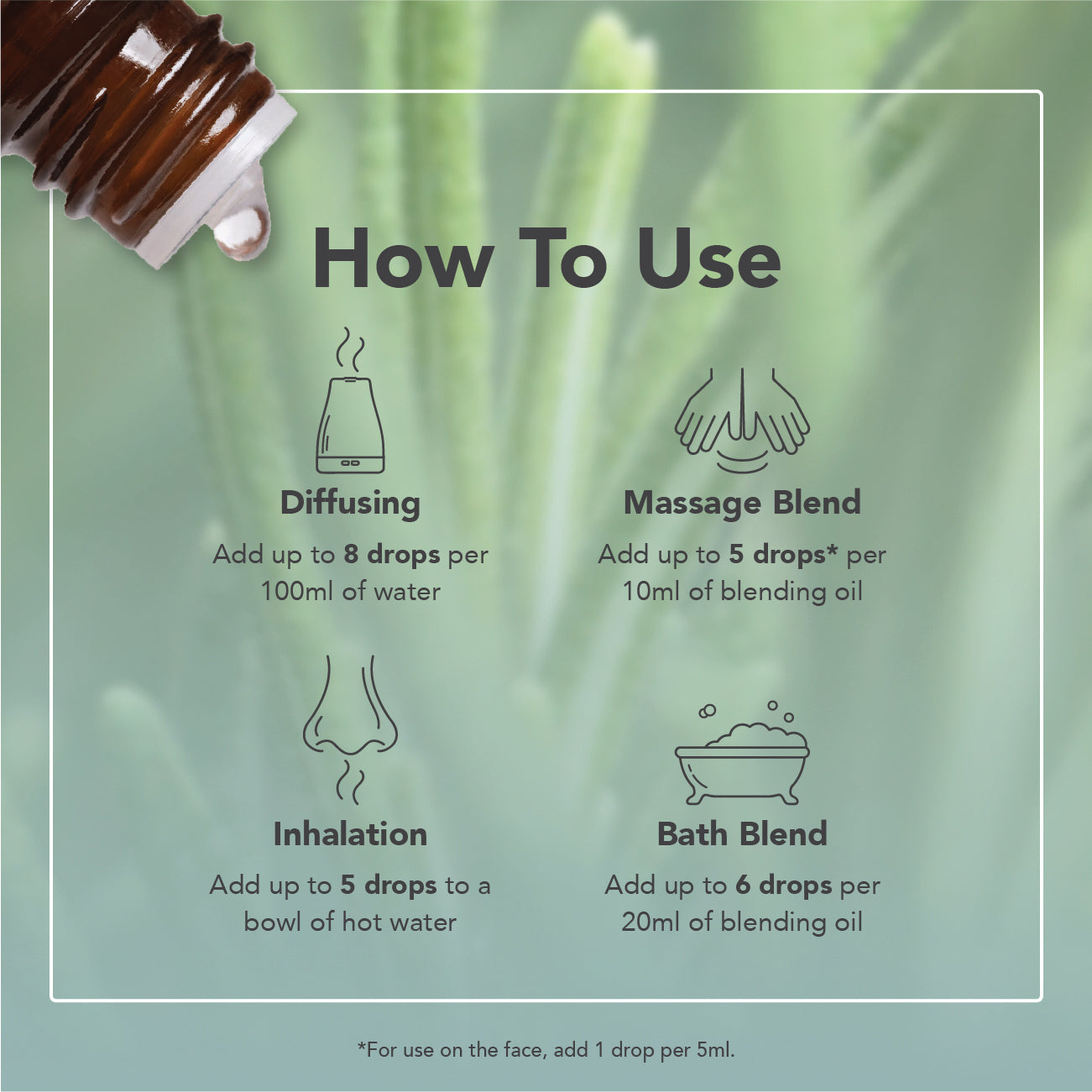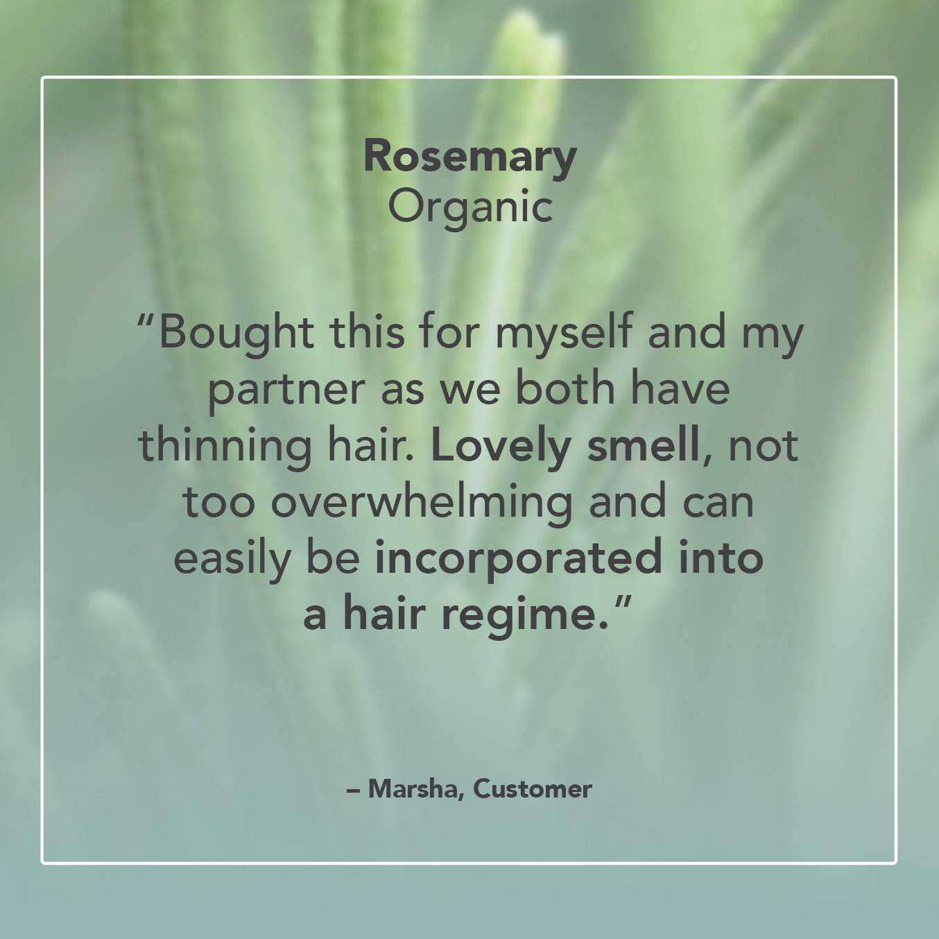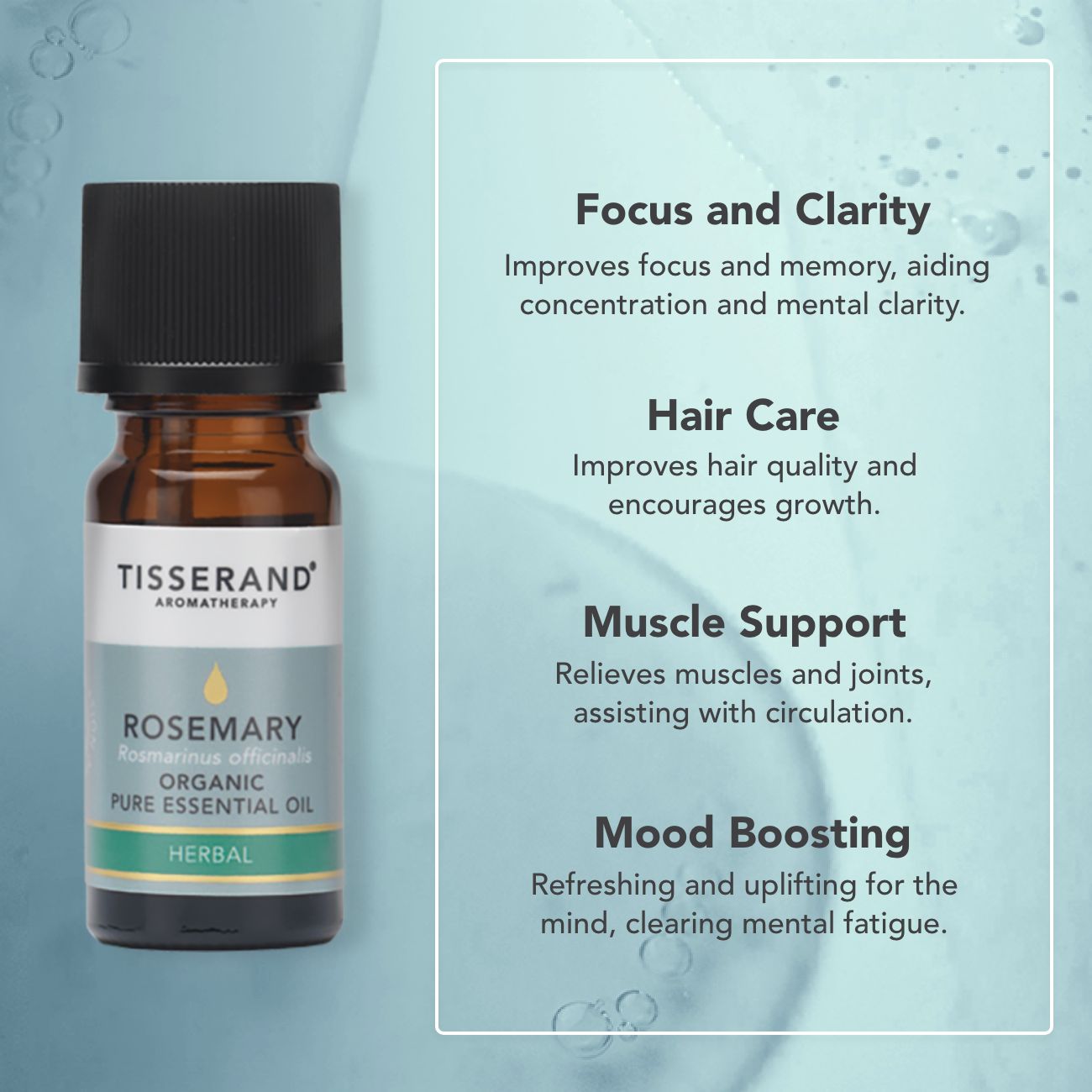 Rosemary essential oil is fresh, green and woody with a powerful, invigorating camphoraceous scent. It’s often used to clear mental fatigue, inspire creativity and improve memory, making it a favourite for study or busy days. It’s also great for soothing tired muscles and joints, and is an effective hair tonic.