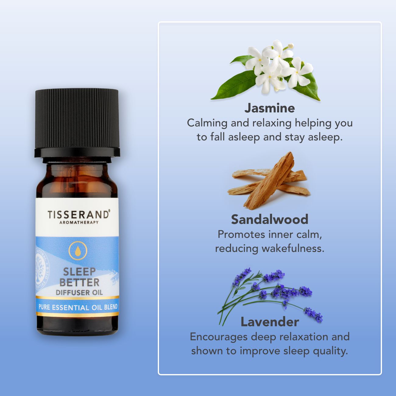 Transform your space into a calming sanctuary with the Sleep Better Diffuser Oil. Designed for use in a diffuser, aroma spa or oil burner, this dreamy blend combines 100% natural pure essential oils of soothing Lavender, warming Sandalwood and calming Jasmine to help you relax and prepare for a blissful night’s sleep.